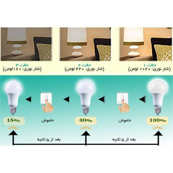 لامپ الایدی LED SMD دیمردار سه حالته پارس شهاب، قابلیت کنترل میزان روشنایی و نور خروجی لامپ در سه سطح مختلف بر اساس سلیقه مصرفکننده را دارا میباشد. بدون نیاز به دیمر جداگانه، به وسیله کلید دیواری روشن و خاموش کردن لامپ، میتوان هر یک از سطوح مطلوب و دلخواه نور لامپ را برگزید.