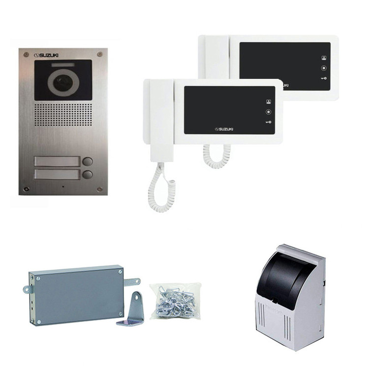 پکیج 2 طبقه کامل سوزوکی شامل یک عدد پنل تک واحدی سوزوکی ،2 عدد گوشی 415Mi با حافظه 4.3 اینچ دکمه لمسی و یک عدد ترانس 12 ولت و قفل زنجیری می باشد. این پکیج اصطلاحا آماده نصب بوده و نیاز به هیچ وسیله دیگری ندارد. البته سیم کشی ها باید انجام شده باشد.